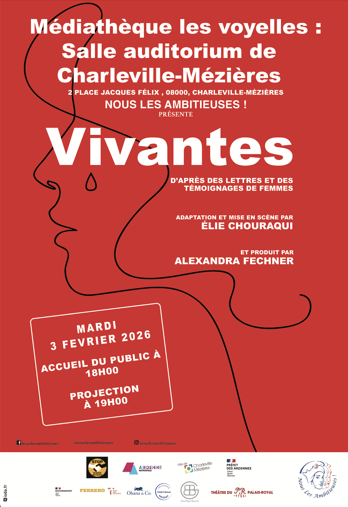 Pour que ces violences cessent ! Pour aller à la rencontre de tous les citoyens en France et à l’étranger. Parce que nous avons rencontré des associations compétentes, celles qui accompagnent le processus de reconstruction de ces personnes. Parce que nous avons dialogué avec les services de police spécialisés sur les dépôts de plaintes, grâce au soutien du Ministère de l’intérieur. Enfin et surtout, parce que des femmes ayant subi des violences ont accepté de nous raconter leurs calvaires et nous ont livré leurs maux. Nous Les Ambitieuses ! vous présente “Vivantes”. Une création théâtrale écrite et mise en scène, d’après de vrais témoignages de Femmes, par Elie Chouraqui et produite par Alexandra Fechner. La pièce d’une durée de 70 mn est mise en scène dans un style épuré. Pour laisser toute la place au texte, aux personnages et à l’émotion de ces instants où la parole se libère. Elle est interprétée par des actrices et des acteurs de renom, investis contre ce fléau. La pièce ou la diffusion de la captation de « Vivantes » est gratuite pour le public. Les représentations sont suivies d’un échange avec le public, afin de débattre des solutions en présence des associations locales qui reçoivent et accompagnent les familles victimes de violences.